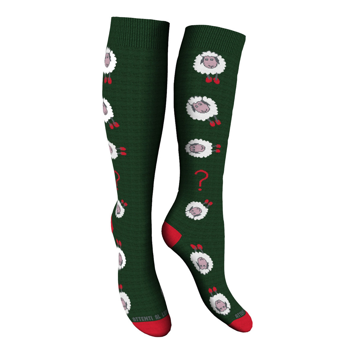 Calcetines largos de mujer en algodón cálido pensados para quienes buscan confort y estilo: 1 par con estampado de ovejitas y composición 70% algodón, 27% poliamida, 3% elastano que garantizan suavidad y calor.