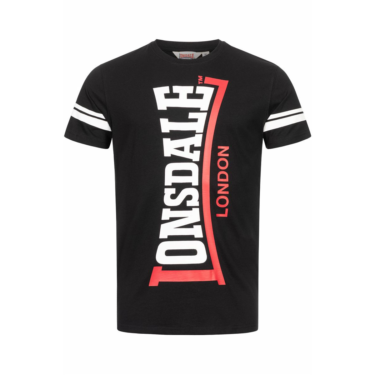 La T-shirt uomo Lonsdale con logo verticale bicolore e maniche a strisce, realizzata in 100% cotone, offre comfort traspirante e una vestibilità regolare, perfetta per il look casual di tutti i giorni.